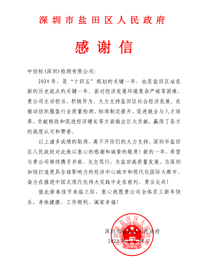 新年伊始,通用技術(shù)中紡標(biāo)(深圳)檢測(cè)有限公司(以下簡(jiǎn)稱“深圳中紡標(biāo)”)收到了深圳市鹽田區(qū)人民政府的感謝信,對(duì)2024年深圳中紡標(biāo)在面對(duì)經(jīng)濟(jì)發(fā)展環(huán)境復(fù)雜嚴(yán)峻等困難,主動(dòng)擔(dān)當(dāng),積極作為,助力鹽田區(qū)社會(huì)經(jīng)濟(jì)發(fā)展,在推動(dòng)紡織服裝行業(yè)質(zhì)量檢測(cè)、標(biāo)準(zhǔn)制定提升、促進(jìn)就業(yè)與人才培養(yǎng)、貢獻(xiàn)稅收和促進(jìn)經(jīng)濟(jì)增長(zhǎng)等方面給予了充分肯定和高度評(píng)價(jià)。
