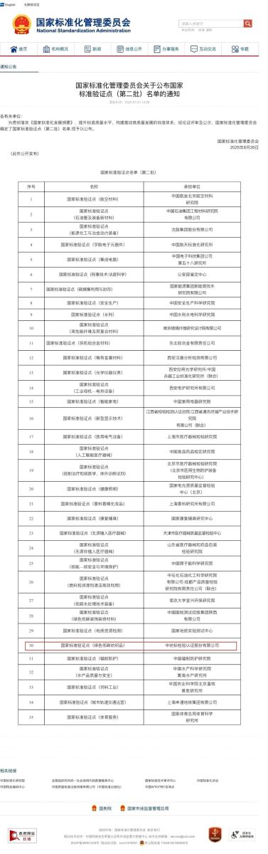 2025年6月26日,國(guó)家標(biāo)準(zhǔn)化管理委員會(huì)印發(fā)《國(guó)家標(biāo)準(zhǔn)化管理委員會(huì)關(guān)于公布國(guó)家標(biāo)準(zhǔn)驗(yàn)證點(diǎn)(第二批)名單的通知》,正式公布包括中紡標(biāo)檢驗(yàn)認(rèn)證股份有限公司在內(nèi)的第二批共計(jì)35家國(guó)家標(biāo)準(zhǔn)驗(yàn)證點(diǎn)名單。