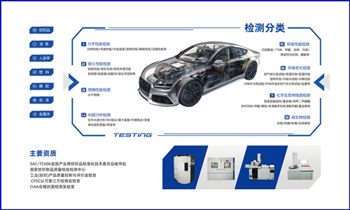 在本次展覽會上,浙江中紡標展示了一系列針對汽車內(nèi)飾材料的檢測技術和服務項目。檢測范圍涵蓋了車門面板、座椅、車頂柵板、腳墊、地毯、內(nèi)飾裝飾件等多個方面,能夠對材料的力學性能、耐久性能、燃燒性能、材料分析、環(huán)保性能、環(huán)境老化、化學及禁用物質(zhì)及微生物等進行檢測。